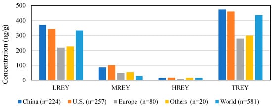The distribution of average concentration of REE in China, the U.S., Europe, others, and world coal fly ash.