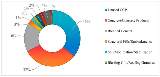 Secondly, by increasing the utilization rate of fly ash, the economic losses caused by environmental pollution during fly ash stacking can be reduced, including the pollution control fees for air and soil caused by strong winds and the pollution control fees for soil and groundwater caused by heavy metals (Hg, As, Se, Pb, Cr, Cd, etc.) due to infiltration [39]. Based on the data of the U.S. Energy Information Administration, Figure 8 shows the coal combustion product production in the U.S. by category. Among them, 3/4 of the CCP were used in the concrete related products and blended cements [41].