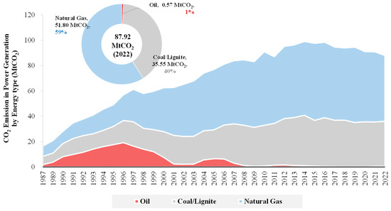The power generation sector is the primary contributor to GHG emissions, accounting for the largest share of CO2 emissions [5,6], representing around 30% of the global total. This is primarily attributed to the combustion of fossil fuels in thermal power plants, including coal-fired power plants [7], natural gas power plants [8], and diesel generators widely employed as the predominant power generation technologies worldwide. According to the Thailand energy statistics report 2022, the power generation sector had the largest share of CO2 emissions, at 35%. Natural gas is responsible for the majority of CO2 emissions in power generation, accounting for 59%, with lignite/coal coming in second, making up 40% of the total [4], as shown in Figure 2.