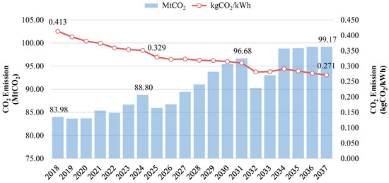 According to the fuel proportion for power generation outlined in the PDP2018 (Rev 1) [9] for the year 2037, or 15 years from now, it is evident that the share of fossil fuels in Thailand’s power production remains relatively high, at 64.78%. Furthermore, there will be a significant increase in CO2 emissions, reaching 99.17 MtCO2, representing a 17.53% increase from the year 2022. Despite the expected rise in the proportion of renewable energy sources, the trend of increasing CO2 emissions persists, as illustrated in Figure 4. Considering the forecast of increased demand for power in the three Power Authority systems, from 236,488 million units in 2022 to 367,458 million units in 2037, representing a 55.38% increase, it is evident that this poses an important challenge for all agencies involved in the power generation sector aiming to achieve carbon neutrality.