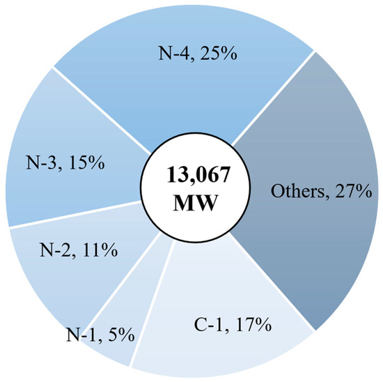 The plan to reduce the electricity generation capacity of natural gas power plants, in accordance with the PDP 2022 plan, specifies that electricity production from natural gas will decrease to only 4850 MW by 2037. This necessitates a proportional reduction in electricity production for all natural gas power plants under EGAT’s operation to ensure alignment of the overall electricity production target with the national plan. As part of this research initiative, natural gas power plants are estimated to constitute approximately 77% of the total capacity. Among them, the N-4 has the highest production capacity, followed by N-3, N-2, and N-1, respectively, with the details outlined in Table 5.