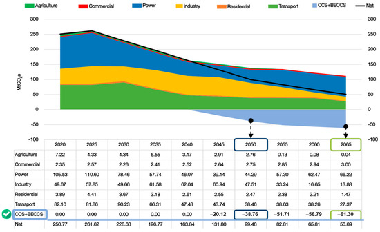 Thailand’s electricity generation predominantly relies on fossil fuels, particularly coal and natural gas, leading to substantial GHG emissions. In pursuit of carbon neutrality by 2050, the country must adopt effective carbon mitigation strategies. Implementing CCS technology is essential for efficiently capturing and storing CO2 emissions from power plants. Thailand has developed plans and set ambitious targets for reducing GHG emissions in the power sector through CCS technology, aiming for approximately 40 MtCO2 of CCS deployment by 2050, and further increasing to around 60 MtCO2 by 2065 to attain net-zero emissions. These targets are outlined in Figure 6 [17]. The comparison of proposed CCS methods with other approaches to achieving carbon neutrality, based on two studies, highlights key differences. The authors of [18] emphasize that while renewable energy (e.g., wind and solar) is essential for decarbonization, it faces challenges such as intermittency and infrastructure costs. CCS, on the other hand, can reduce emissions from existing fossil fuel plants but is costly and has scalability issues. The authors of [19] support a hybrid approach, combining CCS with renewable energy and energy efficiency. However, considering energy efficiency and optimization solutions, which are essential for enhancing the viability of CCS, require advances in optimization methods such as metamodels and response surface methodologies [20].