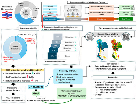 Thailand has committed to achieving carbon neutrality by 2050, targeting the power generation sector, which contributes 35% of the country’s CO2 emissions, as a critical area for intervention. This study explores the transition toward carbon neutrality in power generation, focusing on fossil-fuel-based plants, particularly lignite and natural gas, which remain central to Thailand’s electricity production. A key strategy adopted by the Electricity Generating Authority of Thailand (EGAT) is “Sink Co-creation”, which includes the deployment of Carbon Capture and Storage (CCS) technologies in existing and future lignite power plants, leveraging favorable storage conditions. Additionally, natural gas power plants exhibit significant CCS potential through source–sink matching mechanisms. This study finds that the total greenhouse gas (GHG) emission reductions from fossil-fuel-based power plants could reach 17.07 MtCO2. Of this total, lignite power plants are projected to achieve a reduction of 3.79 MtCO2 by 2036, while natural gas power plants are expected to contribute an additional 13.28 MtCO2 in reductions by 2050. However, the realization of these reductions faces significant challenges, including the high costs associated with CCS implementation and limited investor interest, underscoring the critical need for sustained government support and policy incentives to facilitate progress toward carbon neutrality.