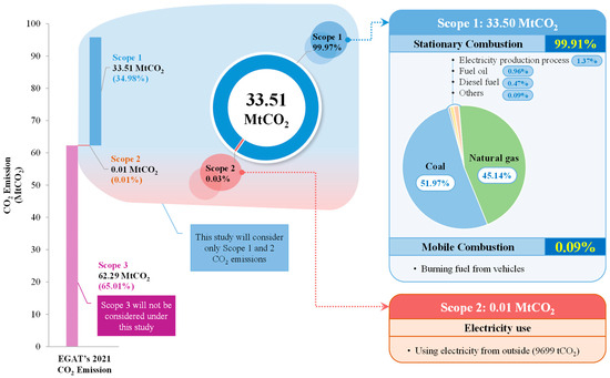 In the baseline year, EGAT’s CO2 emissions amounted to 95.80 MtCO2, with the predominant share occurring in Scope 3 at 65.01%. When restricting the analysis to Scopes 1 and 2, the CO2 emissions equated to 33.51 MtCO2, constituting 34.98% of the total emissions. Within Scope 1, the total CO2 emissions reached 33.50 MtCO2, representing a substantial proportion of 99.91%. The primary source of these emissions is stationary combustion, primarily associated with the burning of coal and natural gas. In contrast, emissions from mobile combustion, such as fuel use in organizational vehicles, contributed only 0.09% to the CO2 emissions within Scope 1. As for Scope 2, the CO2 emissions were relatively low, totaling only 9699 tCO2, as shown in Figure 8.