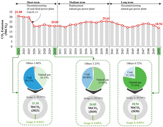 The development scenario for natural gas power plants will utilize the same 90% capture rate [41] as coal power plants. The projected amount of natural gas consumption from 2023 to 2050 pertains solely to the four power plants examined in this study. Each power plant has a unique production capacity, leading to a corresponding proportion of CO2 emissions and capture aligned with the plant’s production capacity. The N-4 Power Plant has the highest capacity among the four plants, currently standing at 44%, equivalent to 3248 MW. Next in line is the N-3 Power Plant, followed by the N-2 Power Plant. Together, they account for 20% and 16% of the total capacity, respectively, amounting to a combined total of 3428 MW. In contrast, the N-1 Power Plant, situated in the northeastern region, has the lowest current production capacity, totaling 650 MW or roughly 9% of the total capacity of the four power plants.
