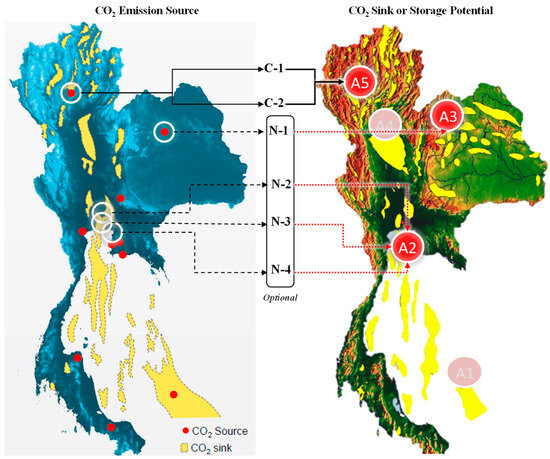 In the application of CCS technology, the primary consideration is the compliance factor of CO2 emissions and storage sources, determining the viability of CCS operations. In this study, the CO2 emission sites at C-1 and C-2 were assessed, revealing their correlation with either the A5 reservoir or the Mae Moh mine. Regarding the N-1 Power Plant, designated as N-1, its CO2 emission site is situated in the northeast, aligning with either the reservoir at location A3 or the Sinphuhom natural gas field [36,37]. Regarding the locations of the remaining natural gas power plants, N-2, N-3, and N-4, they were found to be in proximity, corresponding to the potential reservoir at position A2 or the North Gulf of Thailand. Specific details regarding the locations relevant to this study are illustrated in Figure 10 [38,39,40].
