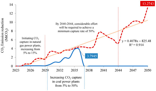 This study illustrates a significant downward trend in CO2 emissions from coal-fired and natural gas power plants due to planned decommissioning and the gradual implementation of CCS technology. While coal power plants achieve reductions through decreased usage and capture capacity, natural gas plants face challenges in scaling up their capture potential in line with increasing electricity demand (Figure 11), where a strong linear correlation is evident (R2 = 0.9140).