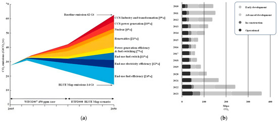 Trends in CCS technology. (a) Technologies identified by the IEA for mitigating CO2 emissions; (b) capacity and commercial status of CCS facilities.