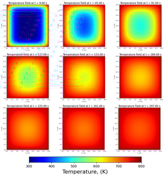The temperature distribution, as shown in Figure 3, shows the heat transfer from the walls of the particle toward its interior during the process. The implementation of wooden layers in the model is visible in the asymmetry in the temperature gradients. It is clear that the heat transfer occurs faster in direction x (along the wooden fibers) than in direction y (across the fibers), due to variations in thermal conductivity in these two directions. This temperature distribution contributes to the observed variations in the decomposition dynamics presented in the next subsection. Heating the entire volume of the particle from room temperature up to 750 K takes approximately 300 s. Very similar results were obtained by Sadhukhan et al. [52], where wooden particles of 20 mm diameter (sphere and cylinder) underwent pyrolysis at 320 °C and 410 °C for the experimental data and at 500 °C and 600 °C for the numerical data. In general, their results showed that the center of the particle reached the external temperature after approximately 300–400 s.