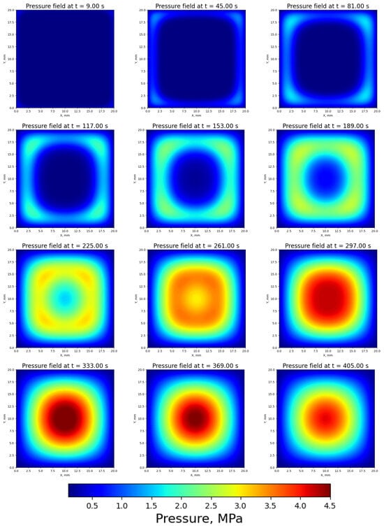 The pressure distribution, presented in Figure 5, reveals a complex relation between the pyrolysis reactions and the gas dynamics. Pressure increase is caused by the gas released in the pyrolysis reactions. In the beginning of the process, the pressure increases at the edges, consistent with the decomposition shown in the mass loss coefficient distributions. As the reaction progresses, pressure builds up in the center of the particle. However, it decreases back to the initial value once decomposition is complete. Returning to its original value, in contrast to the temperature and normalized mass coefficient, it is possible to observe a “decomposition frontline” in the pressure distribution. The heat transfer occurs inward from the edges, heating the particle, which, in turn, initiates the mass decomposition process as the material undergoes pyrolysis. Following this, the pressure wave, driven by the release of the pyrolysis gases, moves towards the center of the particle. This is clearly visible in the pressure distributions for times from t = 117 s to t = 225 s.