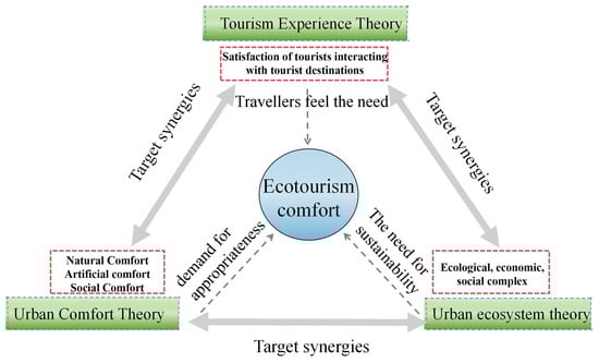 This study is grounded in the tourism experience theory, urban comfort theory, and urban ecosystem theory. The tourism experience theory is defined as psychological satisfaction derived from the interaction between tourists’ behaviors and destination attributes during tourism interactions []. The urban comfort theory highlights that cities fuel their development via multidimensional comfort factors, including natural, built, and social environments. The urban ecosystem theory represents a complex integration of social, economic, and natural elements within specific regions, and it is facilitated by various ecological and socio-economic networks [,]. By integrating the core concepts of urban comfort and urban ecosystem into the tourism experience, the combination of these theories allows for the analysis of spatial aggregation patterns of tourists influenced by comfort factors, aligning with the goals of ecotourism. Ecotourism not only prioritizes the immediate experiences of tourists but also emphasizes the long-term environmental impacts of tourism activities, striving for a balance between tourism and ecological preservation (Figure 1).
