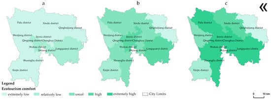 The 2010–2020 evolution of ecotourism comfort in the core area in Chengdu. (a). 2010; (b). 2015; (c). 2020.