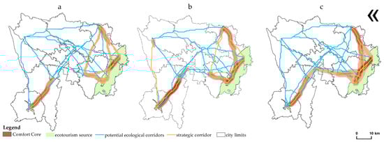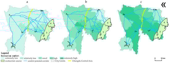 The potential corridor evolution of ecotourism comfort in Chengdu from 2010 to 2020. Numbers: serial numbers of ecological source patches; (a). 2010; (b). 2015; (c). 2020.