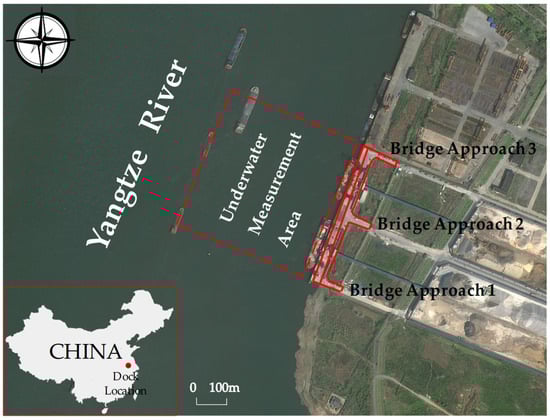 Under the interaction between the river water flow and the riverbed, the evolution law of the lower reaches of the Yangtze River is complex [1,2]. With the influence of human activities such as sand mining, the variable underwater terrain may lead to serious bank slope erosion, posing a threat to the bank slope stability and the safety of the main engineering structure [3,4,5]. Underwater terrain data are the foundation of dock research, and how to efficiently obtain high-precision underwater terrain data remains a challenge in the field of surveying and mapping [6]. Liu [7] proposed a fast and economical method for the construction and continuous monitoring of reservoir terrain, effectively integrating sonar detection data, mapping data, and manual measurement data to construct the bottom terrain topography of a reservoir. Ivanoski [8] determined the amount of sediment in the reservoir and identified the areas mostly affected by sedimentation processes through regular underwater terrain measurement. Underwater terrain measurement mainly includes two aspects: water positioning and water depth measurement at the positioning points. Ceylan [9] determined the changes in surface area and volume of Altinapa Reservoir based on underwater terrain measurement and water depth data. Currently, the commonly used method for underwater terrain research in dock areas is still single-beam inspection.