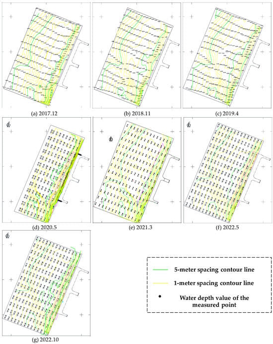 Underwater topographic survey contour map of the Yuanjin dock from 2017 to 2022.