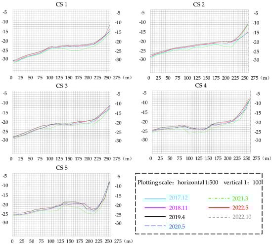 Cross-section comparison diagram of the Yuanjin dock front from 2017 to 2022.