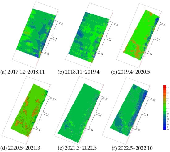 Based on the multi-beam data from December 2017, November 2018, April 2019, May 2020, March 2021, May 2022, and October 2022 in the forefront area of the Yuanjin dock, maps of adjacent time period river erosion and sedimentation change were created. The erosion and sedimentation of the dock section were analyzed, and the results of the changes in the river regime are shown in Figure 5 (negative values indicate sedimentation; positive values indicate erosion).