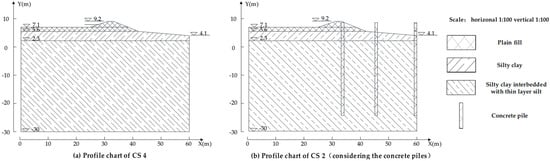 To investigate the impact of underwater terrain and concrete pile foundations in dock areas on the stability of the bank slope, the following four scenarios were considered for the typical cross-sections mentioned above: