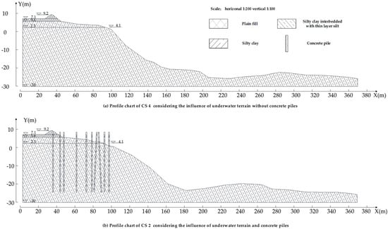 - Typical section CS2, considering the influence of underwater terrain and the presence of concrete piles. That is, the situation of adding concrete piles within the calculation range of 0–370 m.