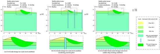 The stability calculation results of the typical cross-section under different load conditions and calculation conditions are shown in Table 4. Detailed calculation conditions, sliding arc position, center coordinates, radius, safety factor, etc., are shown in Figure 8 and Figure 9.