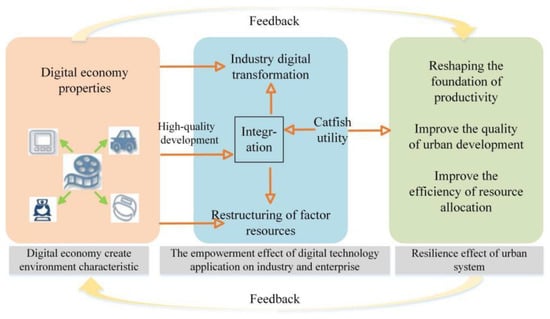 In March 2021, China further proposed responding to the latest theories and directions in urban development, conducting pilot demonstrations of urban modernisation, and building habitable, innovative, smart, green, humanistic, and resilient cities. Consequently, UR was introduced in national high-level documents for the first time, and the construction of resilient cities became a national strategy. The ‘black swan’ and ‘grey rhinoceros’ events, such as the extraordinary rainstorm in Henan Province of China, have significantly affected urban development and generated increased demands in urban capacity to resist various uncertain disturbances and risk pressures. Due to the growth of 5G and other digital techniques, digitalisation has gradually changed people’s lives and production methods, providing a valuable opportunity for building resilient cities with strong implications on infrastructural, economic, ecological, and other resilient constructions in these cities. In the new era, the digital economy (DE) continues to deliver information rapidly in the social context through efficient data processing capabilities during the new crown pneumonia epidemic, enabling business productivity to remain steady and stimulating urban recovery []. Thus, the DE is a significant engine that fuels city development and injects new vitality to improve UR.