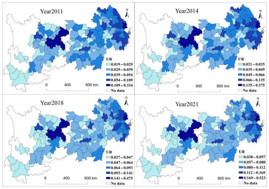 The different weights of the indicators often reflect their degree of influence in the entire indicator system and the imbalance of the role of each indicator. After consulting the related literature and merging the data obtained with the global principal component analysis method, the weights of the evaluation indicators were assigned in this study to ensure the relative accuracy of these weights. From the perspective of economic resilience, economic strength, vitality, and security are important indicators of economic resilience. From the perspective of social resilience, population pressure is the core of social resilience evaluation, with the highest weight value. Ecological resilience evaluation consists of resource use of all the components of the assessment scores based on environmental governance; therefore, it has a larger weight, and the construction of ecological civilisation is a vital aspect to insure the precision of this evaluation. From the perspective of engineering resilience, primarily constituting the main drainage capacity, water supply capacity, and residential life, the weight of different evaluation indicators is different. Figure 4 shows the resilience of the sample cities in the YREB from 2011 to 2021, which visually reveals the spatial evolution of UR (Figure 4).