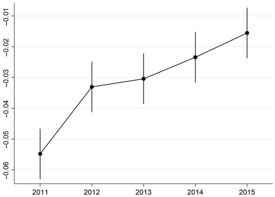 A good external environment provides strong support for digitally enabled industries and digital innovation and is related to the direction of developing new products, business models, and modes. Therefore, UR may positively affect the DE by preventing the impact of reverse causality among the DE and UR. We analysed the effect of DE on UR in the YREB by considering the pilot zone policy as an external shock factor. In 2015, Guizhou became the first regional pilot area, and several provinces and cities have since introduced comprehensive pilot zone policies based on big data. This study divided the data into experimental and control groups by city and year of policy introduction, built a double-difference model to explore the effect of DE, and conducted a parallel trend test on the level of UR. Figure 10 shows that the difference in the trend between the two groups is more significant after policy implementation, and the model meets the parallel trend hypothesis.