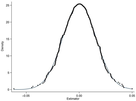 In addition, to prevent ‘errors in policy effects’, a placebo test was performed on the double-difference model by sequentially generating the interactions for the policy variables with time and repeating the process 500 times (Figure 11). The results displayed that the regression coefficients were distributed around the zero value; that is, the random sample combination did not have a substantial influence on the level of UR. On the basis of the results of the parallel trend and placebo tests, a difference-in-difference (DID) estimation model was developed to determine the effect of the policy on the UR in the Big Data Comprehensive Test Area (Table 11). Columns (1) and (2) of Table 11 display the estimated models for the dummy variables of the DID and policy, and Columns (3) and (4) show the estimated models for the interaction between the DID and policy. The regression coefficient for the DE pilot policy variable was strikingly positive, indicating that the DE promotes UR in the study area. The coefficients of the DE index and policy interaction were also positive.