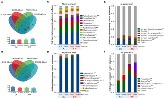 The Venn diagram that was used to analysis the distribution of OTUs among the different treatments indicates a total of 7320 bacterial OTUs and 734 fungal OTUs observed in this study (Figure 1A,B). These bacterial OTUs were classified into 41 phyla, 503 families, and 907 genera, while the fungal OTUs were categorized into 12 phyla, 144 families, and 239 genera. In the CK, there were 7 unique bacterial OTUs at the 0–20 cm depth and 12 unique OTUs at the 20–40 cm depth, with a total of 69 OTUs shared between these two layers. In contrast, under the RW, the unique OTUs were 10 at the 0–20 cm depth and 26 at the 20–40 cm depths, with 283 shared OTUs between these layers. For the fungal community, there were 49 OTUs shared between the two treatments, while the unique OTUs in CK and RW are 17 and 9, respectively.