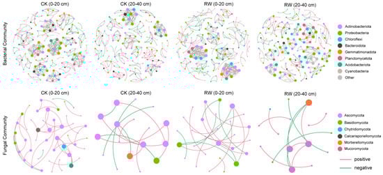 Co-occurrence networks were generated separately for soil bacteria and fungi in both the CK and RW treatments (Figure 2 and Table 2). The bacterial cooccurrence network comprised 314 nodes in the CK and 322 nodes in the RW, while the fungal cooccurrence network included 65 nodes in the CK and 44 nodes in the RW. In the bacterial networks, the CK exhibited 305 positive correlation networks (52.77%) and 273 negative correlation networks (47.23%), whereas the RW displayed 248 positive links (47.51%) and 274 negative links (52.19%). This indicates that the coexistence effect among different bacterial groups in CK is greater than the exclusion effect, while the opposite trend is observed in RW. For the fungal networks, the CK exhibited 42 positive links and 12 negative links, whereas the RW had 18 positive and 15 negative links. RW showed greater modularity and a higher number of modulars at depths of 20–40 cm. The increase indicates that, although the microbial connectivity decreases after irrigation with RW, the interaction among soil microbial communities is enhanced, resulting in tighter connections.