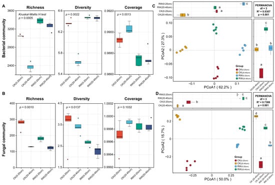 Alpha and beta diversity in soil microbial communities across the different treatments. Alpha diversity of bacterial (A) and fungal (B) community among the two treatments, (C,D) represent the beta diversity of bacterial and fungal communities, respectively. CK: saline–alkali soil not irrigated with reclaimed water, RW: saline–alkali soil irrigated with reclaimed water. These indices were calculated for community richness, diversity, and coverage. p-values were analyzed using Kruskal-Wallis H test. Different lowercase letters show statistically significant differences.