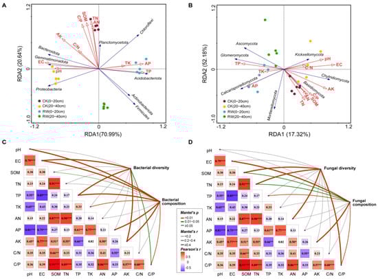 Ordination biplots from the redundancy analysis (RDA) were utilized to identify the relationships between soil bacterial and fungal communities (blue arrows) and soil properties (red arrows). (A) illustrates the relations between soil properties and bacterial communities at the phylum level; (B) presents the relations between soil properties and fungal communities, also at the phylum level. Mantel tests were conducted to examine the correlations between microbial community composition and diversity with soil properties. (C) shows how soil properties influence the composition and diversity of the soil bacterial community, while (D) depicts the relationships between soil properties and the fungal community. * p < 0.05, ** p < 0.01, *** p < 0.001. CK: saline–alkali soil not irrigated with reclaimed water, and RW: saline–alkali soil irrigated with reclaimed water.