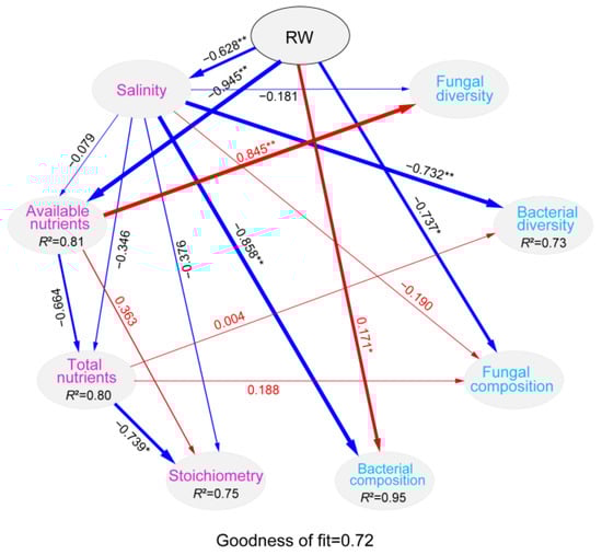 PLS-PM analysis was conducted to assess the direct and indirect effects of RW irrigation and soil properties on the composition and diversity of microbial communities (Figure 5). The model revealed that the soil salinity, available nutrients, total nutrient levels, stoichiometry, and the microbial community structure collectively accounted for 72% of the variance observed in RW irrigation. As shown in Figure 5, salinity had a significant negative direct effect on both bacterial composition and diversity, with coefficients of −0.86 and −0.73, respectively (p < 0.01). In contrast, the available nutrients had a positive direct impact on fungal diversity (0.85, p < 0.01). While RW irrigation positively and directly influenced bacterial composition, it had a negative direct effect on the fungal community. Furthermore, RW irrigation indirectly affected fungal diversity by negatively regulating the levels of available nutrients (−0.95, p < 0.01). Overall, the results indicated that soil salinity and available nutrients were the most significant factors influencing the microbial community structure.