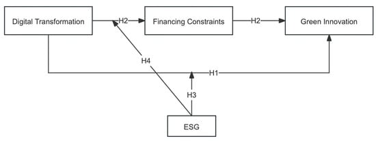 In terms of external regulation, superior ESG performance signals a firm’s strong environmental awareness and commitment, increasing access to external stakeholder support like government subsidies [78]. These subsidies reduce the financial risks of green technology development and incentivize participation in policy-driven green innovation initiatives [79]. Furthermore, according to the stakeholder theory, firms must meet the multiple expectations of different stakeholder groups to fulfill their responsibilities to stakeholders [80]. Such support and subsidies come with accountability mechanisms that require firms to meet green innovation benchmarks established by governments and other stakeholders. This external monitoring pressure serves as a critical incentive for firms to optimize resource allocation. It encourages the integration of digital technologies into green innovation processes, mitigates short-term decision-making tendencies during digital transformation, and fosters increased investment in green innovation [68]. Thus, we propose the third hypothesis:
