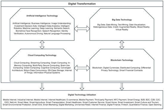 Based on existing studies [60,89,101], this research calculated word frequencies of 74 keywords, covering five dimensions to measure DT. These keywords (shown in Figure 2) encompass various technologies and a wide range of application areas. The words used in the annual report reflect the operating philosophy and development trajectory of firms [102], making it a viable approach to assessing digital transformation through annual report analysis. The word-frequency data were obtained by analyzing the text of annual reports using the “jieba” segmentation tool of Python 3.9. To avoid ambiguity caused by the broad meanings of some commonly used words, this study manually filtered out words that were less relevant to AI applications. For example, the term “artificial intelligence” was matched with the phrase “Artificial Intelligence Co., Ltd.”, and its frequency was calculated. Then, such expressions were excluded from the overall frequency of the “artificial intelligence” keyword. This process was repeated to obtain the final adjusted frequency for each term. Following Liu et al. [89], these word frequencies were then summed and logarithmically transformed to derive the quantitative indicators of a company’s digital transformation as follows: