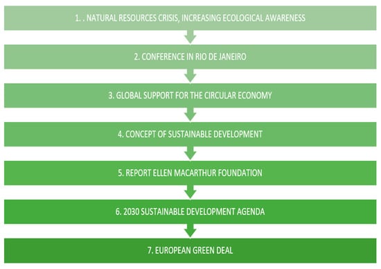 The development of the concept of circular economy (CE) worldwide is a result of various ongoing socio-economic transformations and responses to the growing challenges associated with the excessive consumption of natural resources and waste generation. Figure 1 provides an overview of the key events and processes influencing the shaping of issues related to circular economy.