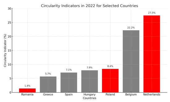 The key selection criterion was circularity indicators, which reflect the level of efficiency in resource management and recycling. In 2022, the circularity rate was 1.4% for Romania, 8.4% for Poland, and 27.5% for the Netherlands (Figure 2). The study chose the Netherlands as a country with a very high circularity rate, Poland as a country with a medium level of circularity, and Romania as a country with the lowest rate. This selection enables the examination of both the benefits and challenges associated with implementing circular economy in these countries.