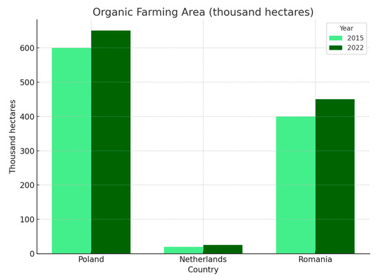 In the studies conducted by Jętkowska et al. [54], it was found that in 2020, the total area of organic agricultural land in Poland amounted to 509.3 thousand hectares, which represented 3.47% of the country’s total agricultural area of 14.7 million hectares. Increased interest in organic farming is a phenomenon noticeable worldwide. Between 2004 and 2018, the share of agricultural land globally allocated to this type of farming increased from approximately 30 million to 71.5 million hectares, and the total area of organic agricultural land has grown by 69% over the past decade [58].
