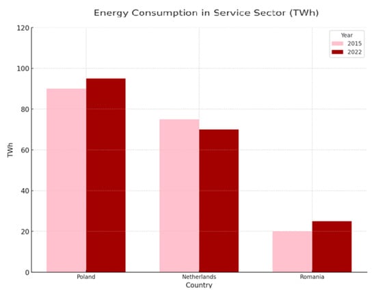 Energy consumption in the Polish service sector (Table 4) increased from 91.2 TWh in 2015 to 94.8 TWh in 2022, representing a growth of 3.95%. The increased demand for energy is mainly due to the expansion of service activities and digitization, associated with the intensive use of power-hungry technologies such as servers and data centers. This growth places pressure on the service sector to implement circular economy (CE) principles, which promote sustainable energy management. As part of CE, the service sector aims to minimize its carbon footprint by optimizing energy consumption, implementing energy-efficient technologies; using automation to regulate lighting, heating, and air conditioning; investing in renewable energy sources such as photovoltaic panels; and monitoring energy usage, which helps reduce energy demand without compromising service quality. These actions support CE goals and reduce the environmental impact of the service sector.