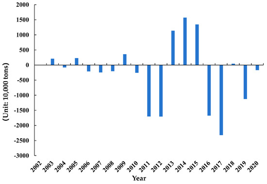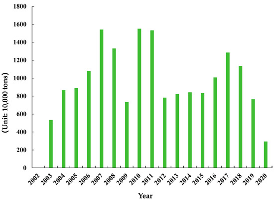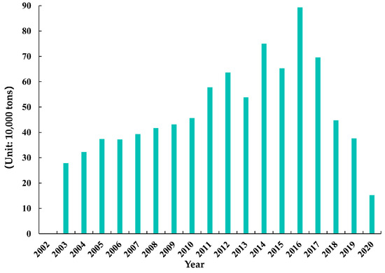 Due to the lack of specific data on energy consumption for the waterway transportation industry in current statistical yearbooks—and because the energy chapter of the China Statistical Yearbook aggregates data for the transportation, storage, and postal sectors—this study estimated the energy consumption of the waterway transportation industry as follows: the ratio of the total output of the waterway transportation industry (including waterborne passenger transportation, waterborne cargo transportation, and auxiliary transportation activities) to the total output of the combined transportation, storage, and postal sectors was used to calculate energy consumption. The study analyzed data from 2002 to 2020.