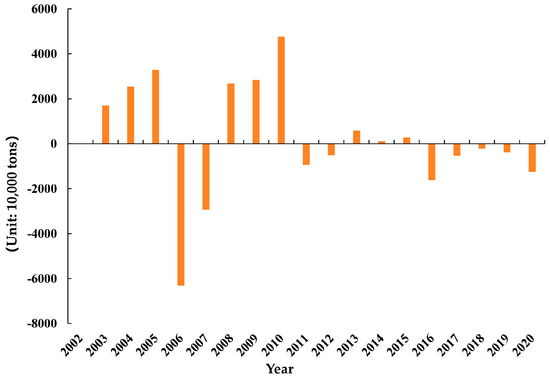 An analysis of the data in Table 2 reveals that between 2002 and 2020, carbon emissions from China’s waterway transportation sector exhibited notable growth with some fluctuations. During the initial phase (2002–2017), emissions increased annually, rising from 42.17 million tons in 2002 to a peak of 118.81 million tons in 2017—an approximate 182% increase, with an average annual growth rate of 6.6%. This surge was closely tied to China’s rapid economic expansion during this period. However, after reaching a peak in 2017, emissions began to decline, dropping to 100.86 million tons in 2020—a reduction of approximately 15% compared to 2017. This downward trend aligns with slowing economic growth, industrial restructuring, and the effective implementation of energy-saving and emission-reduction policies under China’s “new normal” economic conditions. It should also be noted that emissions in 2020 may have been affected by the COVID-19 pandemic.