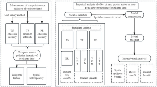 In this study, we first applied the unit survey method to calculate the emission intensities of TN, TP, and PE, illustrating the spatiotemporal characteristics of agricultural NPSP in the Dongting Lake Plain. Subsequently, we used agricultural NPSP as the dependent variable, incorporating the dummy variable for the Zero Growth Action policy on fertilizers and pesticides, along with control variables such as regional economic development levels, urbanization levels, agricultural technological progress, and cropping structure. These factors were included in a spatial econometric model to evaluate the impact of the Zero Growth Action policy on agricultural NPSP and assess the spatial effects of various influencing factors. Figure 2 shows the methods and processes we used.