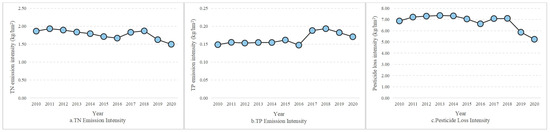 TN and TP Emission Intensity and Pesticide Loss Intensity in Dongting Lake Plain from 2010 to 2020.