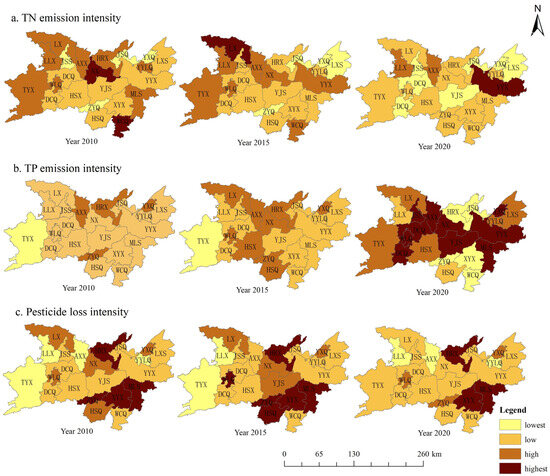 To investigate the impact of the Zero Growth Action on farmland NPSP since 2015, Figure 4a–c displays the spatial distribution of TN, TP emission intensities, and pesticide loss intensities for the years 2010, 2015, and 2020.