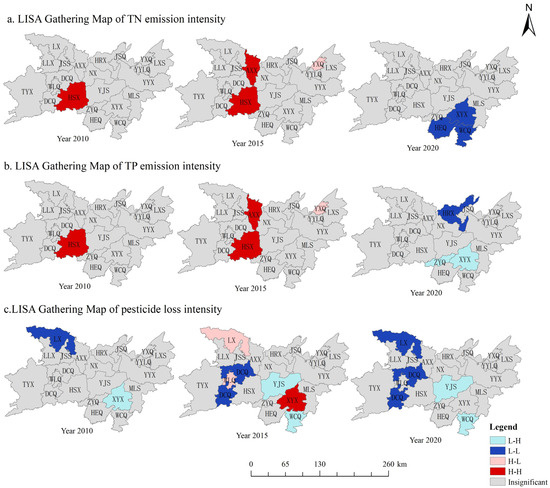 To further explore the local spatial clustering characteristics of farmland NPSP intensity in the Dongting Lake Plain, the Local Moran’s I index was used to measure spatial clustering of pollution intensity for 2010, 2015, and 2020. Figure 5 displays the LISA clustering maps of TN, TP emission intensity, and pesticide loss intensity, with all clusters tested for significance at the 10% level.