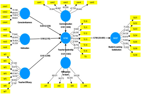 The indirect effect of teacher dispositions (communication, conscientiousness, motivation, teacher efficacy, willingness to learn) on student learning satisfaction through the mediation variable of teacher leadership found that two hypotheses were significant (H3: β = 0.152, t = 2.092, p < 0.036); (H4: β = 0.152, t = 2.092, p < 0.036), respectively, as indicated in Table 7. These values show that both conscientiousness and motivation contribute to student learning satisfaction. Other relationships, such as H2 (Com → SLS), H5 (Tef → SLS), and H6 (WTL → SLS), had higher p-values (0.100, 0.163, and 0.119), indicating weaker or non-significant associations.