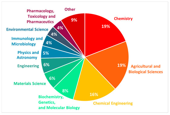 As previously discussed, the search conducted in the Scopus database resulted in 1498 articles associated with 27 different areas of academic research. The areas of chemistry, agricultural and biological sciences, and chemical engineering stood out with 623, 611, and 536 articles, respectively. The percentage contribution of each area is presented in Figure 1.