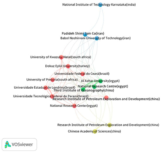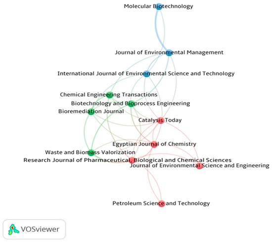 The articles analyzed were distributed across 12 different journals: the International Journal of Environmental Science and Technology, the Journal of Environmental Management, the Egyptian Journal of Chemistry, the Bioremediation Journal, Molecular Biotechnology, Waste and Biomass Valorization, the Journal of Environmental Science and Engineering, Chemical Engineering Transactions, Biotechnology and Bioprocess Engineering, Catalysis Today, the Research Journal of Pharmaceutical, Biological and Chemical Sciences, and Petroleum Science and Technology. Thus, the software identified that all these journals published only one article, with no emphasis on productivity. The network map shown in Figure 2 illustrates the relationships between these journals.