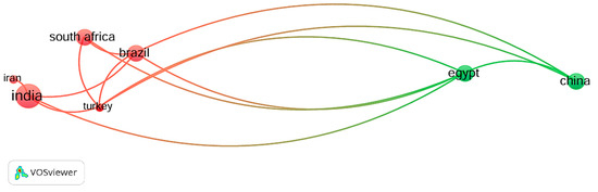 India had the highest number of publications (3), followed by Brazil (2), China (2), Egypt (2), and South Africa (2). Iran and Turkey came in sequence with only one publication each. Figure 3 confirms this distribution since the larger nodes indicate more published articles. In addition, the links that connect these nodes (countries) demonstrate scientific collaborations between authors of different nationalities.