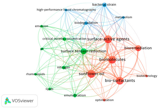 In Figure 4, the keywords are divided into three different clusters, separated by the following colors: green, red, and blue. Analyzing the map, it is possible to notice that the most frequently occurring keywords (larger nodes) were “bio-surfactants”, “biomolecules”, “sunflower oil”, and “surface-active agents” (9), followed by “bioremediation” and “surface tension reduction” (7), as described in Table 5. These terms share a stronger connection, as they are linked by thicker lines and are highlighted in the same color (red). The fact that thicker lines connect these words indicates that they appear simultaneously in the same articles, while the same color indicates that they belong to similar themes. In this context, as biosurfactants, which are known as amphiphilic biomolecules and surface-active agents, were the focus of all the works, this explains why the terms “bio-surfactants”, “biomolecules”, and “surface-active agents” are among the most common. Sunflower oil was the most used substrate for the production of biosurfactants, which explains why the term “sunflower oil” also stood out. Additionally, the prominence of the terms “bioremediation” and “surface-active agents” was linked to the studies conducting bioremediation tests with biosurfactants in various contaminated environments while simultaneously performing surface tension reduction tests to measure the surfactant capabilities of the biosurfactants.